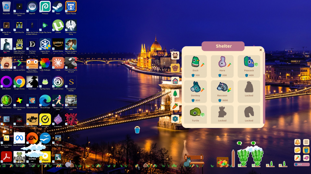 Cozy Sanctuary is kind of hard to explain. It’s an idle clicker that can run in the background and you can visit it at your leisure as you type articles, do research, chat with friends, etc. Although you do need to visit it to see it grow before you earn enough money to have it start running on its own like a true idler. I’ve dropped some images to give you an idea, but know this is a zen game while also something you can’t just open and leave to run. At least not till you’ve clicked, fed, cleaned and made enough points to have things running on their own.